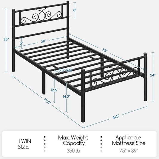 Twin Bed Frame, Metal Platform Bed, Headboard, Footboard, No Box Spring Needed